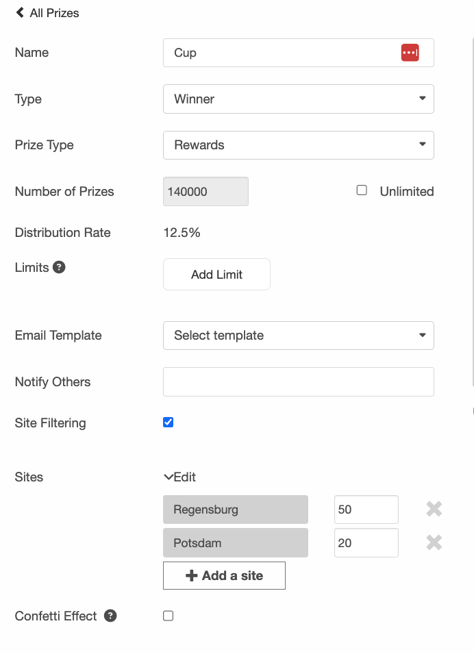 Sometimes you may wish to restrict your prizes to specific locations. For example, for larger stores you may want to giveaway 50 prizes whereas small stores may only need 5. This article outlines how you can achieve this using the Odicci platform.
