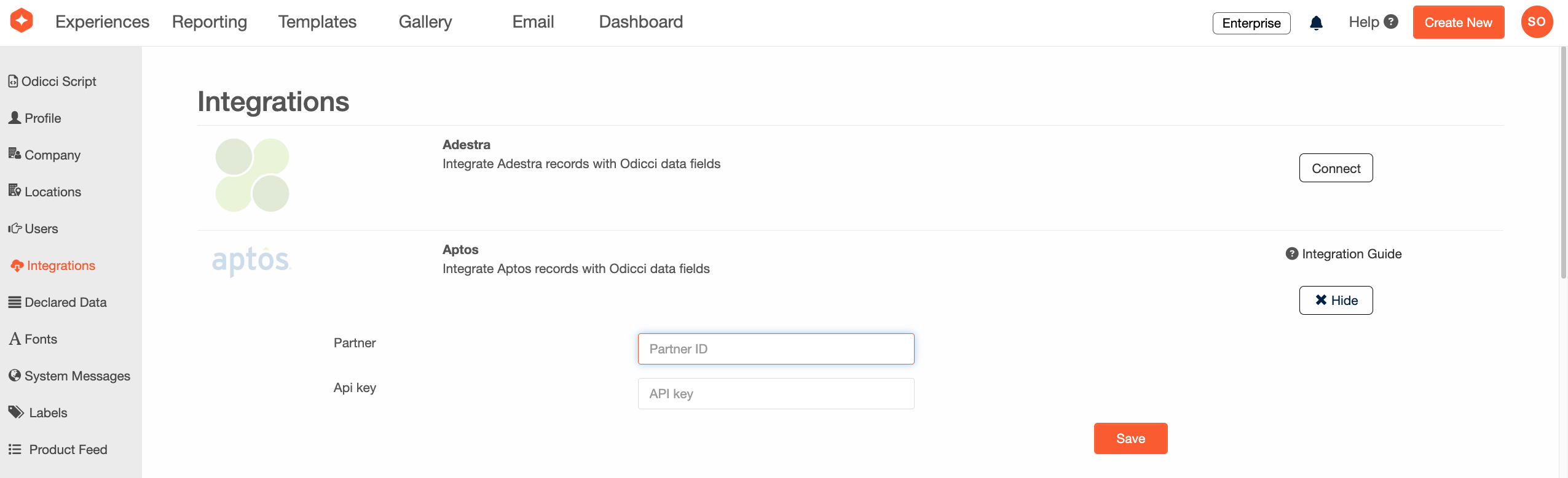 In your Odicci account click on the icon in the top right corner and select settings. Within settings navigate to Integrations, scroll to Aptos and click on ADD.