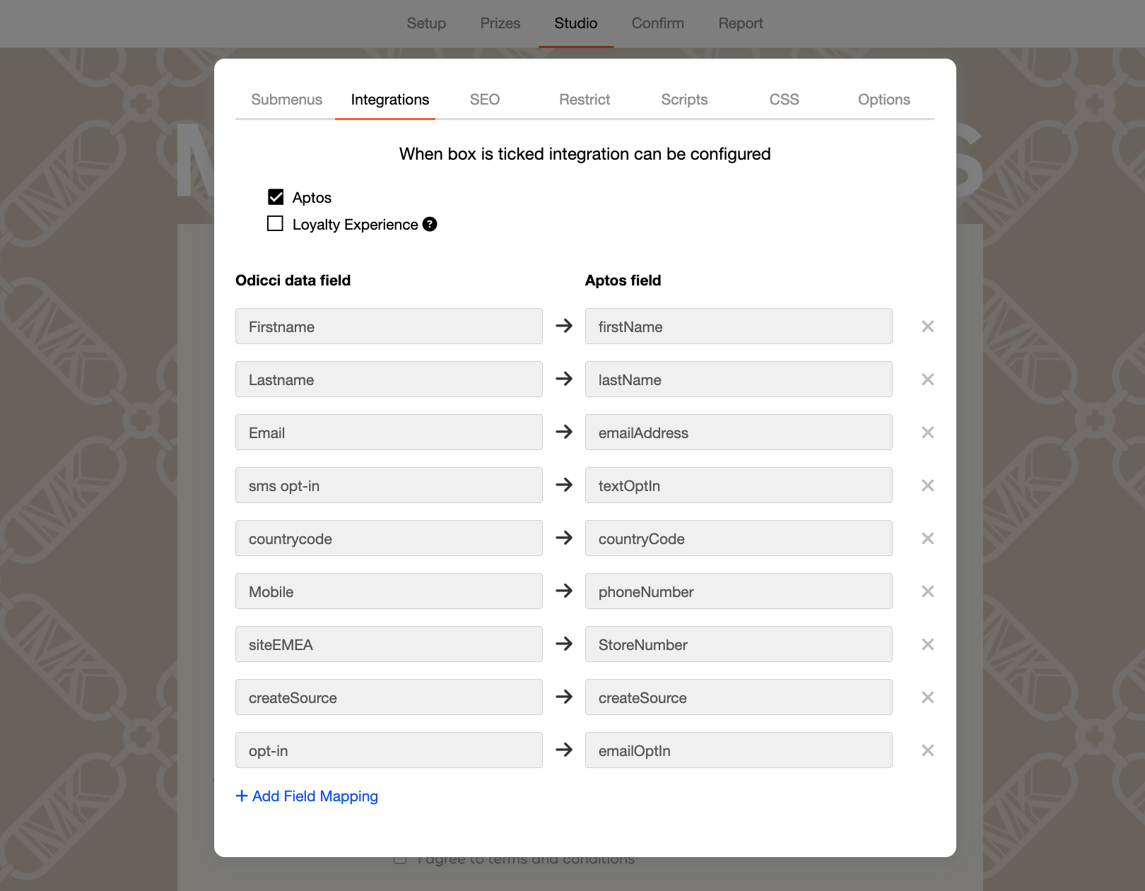 In your Odicci experience click on settings (cog wheel inside studio) to access the integration configuration. Tick the Aptos integration checkbox to activate the integration for the current experience.