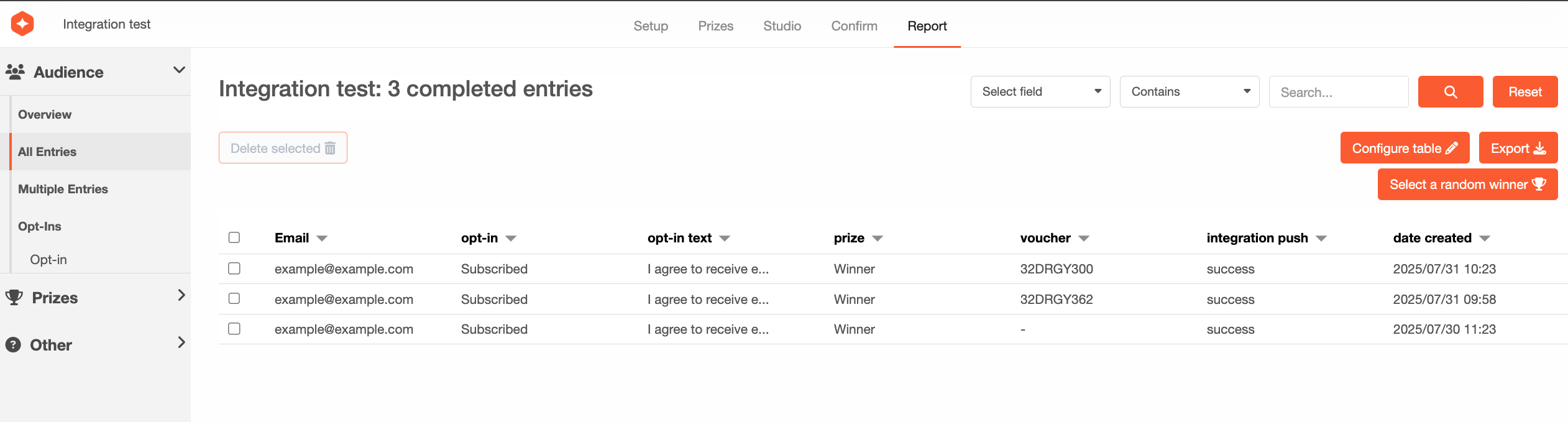 Once submitted, you can check the integration push has been successful in the reporting section of the experience. If the push has failed, please ensure you have mapped all fields correctly before contacting support.